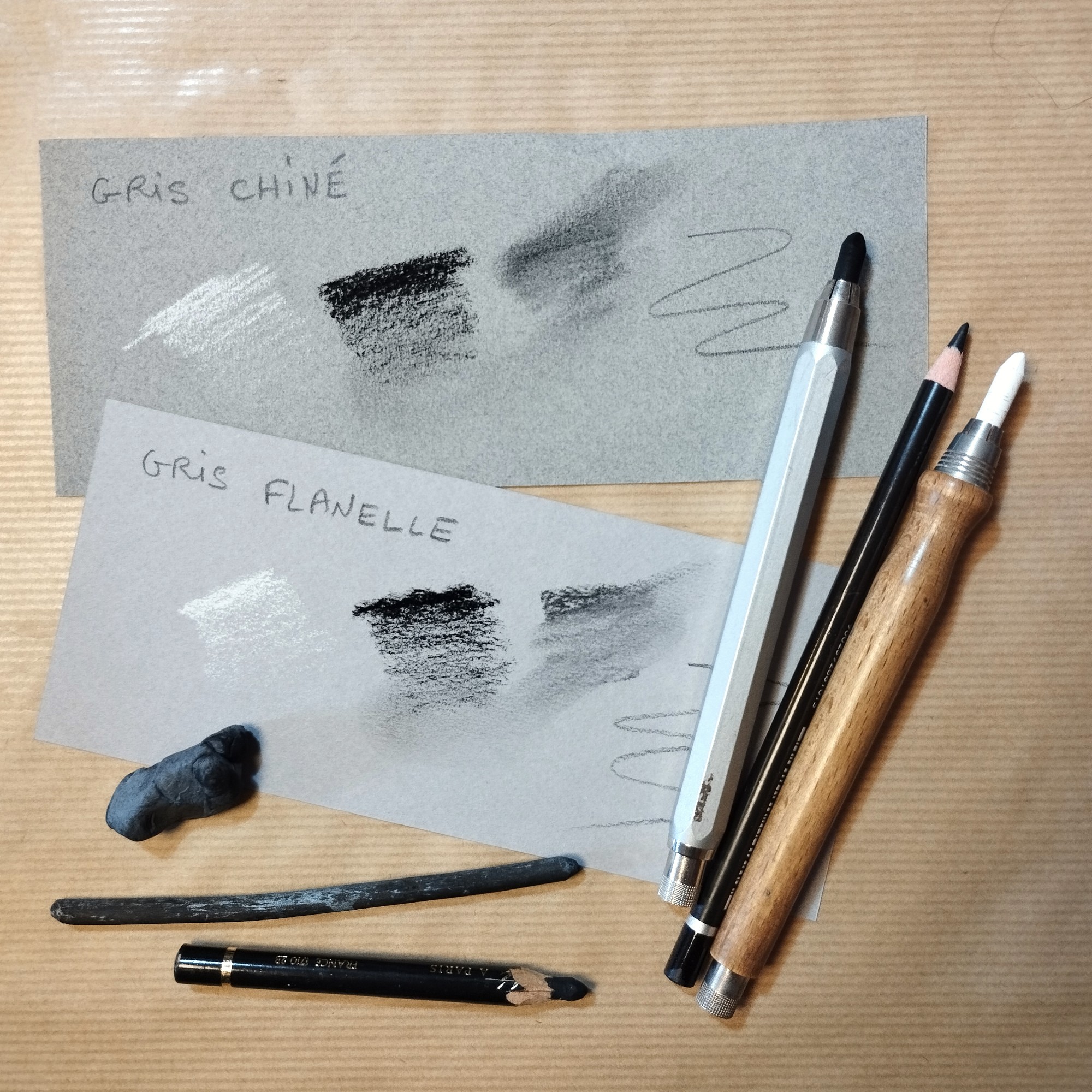 Vous pouvez choisir le papier gris flanelle ou gris chiné. Le gris flanelle est complètement uni, le gris chiné a des tons de gris différents.