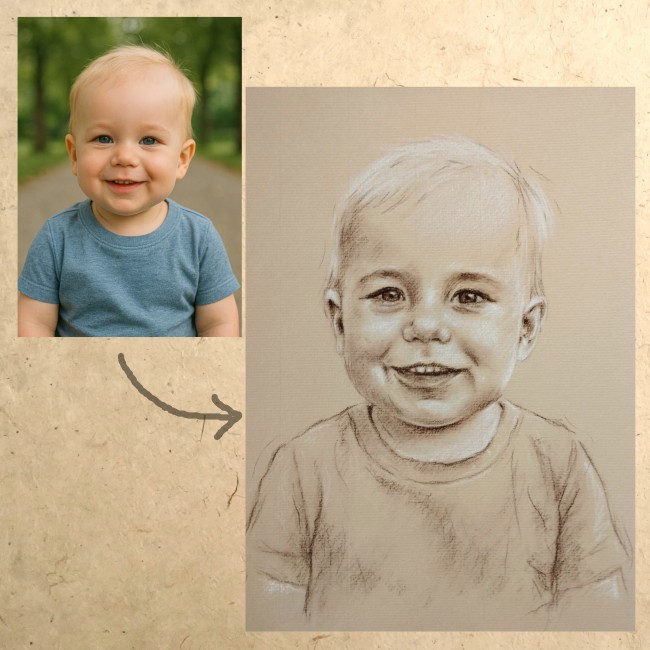 Le papier est un papier "Ingres". Il s'agit d'un papier naturel "vergé", ce qui signifie qu'il laisse apercevoir de fines lignes parallèles horizontales dans l'épaisseur du papier. C'est un papier très utilisé par les artistes. Je peux l'utiliser sur la face "vergé" (laissant apparaitre les lignes, comme sur l'exemple du bébé), ou sur l'autre face, qui est simplement un peu granuleuse (comme sur l'exemple de la petite fille). Il est aussi possible de réaliser le dessin sur papier lisse type Canson mil-teintes. Si vous avez une préférence, précisez-le moi.