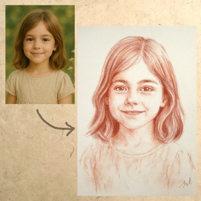 La sanguine est utilisée depuis très longtemps par les anciens maitres, notamment pour les portraits, en raison de sa teinte ocre rouge qui sublime les tons de peau. La mine sanguine utilisée permet un rendu à la fois flou et doux, et en même temps assez précis. Utilisée sur un papier Ingres blanc, elle permet d'obtenir un portrait aux tons chaleureux.