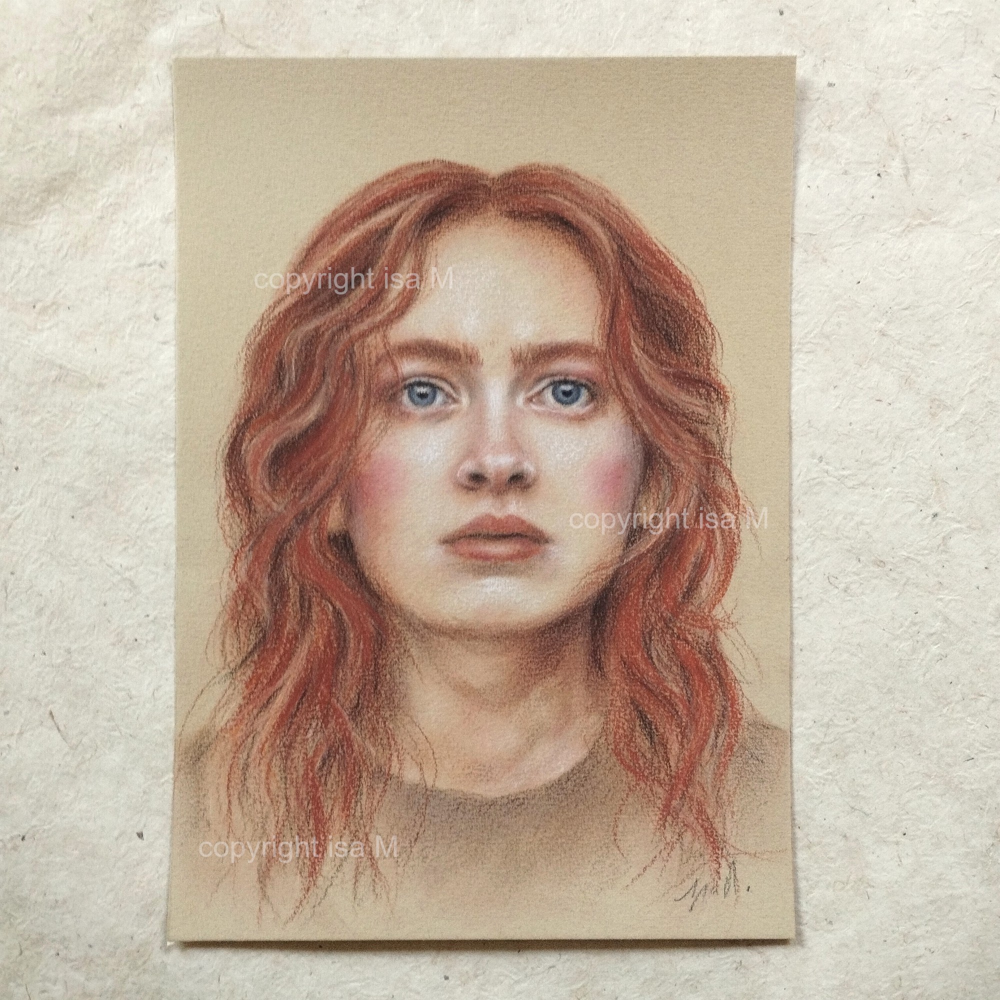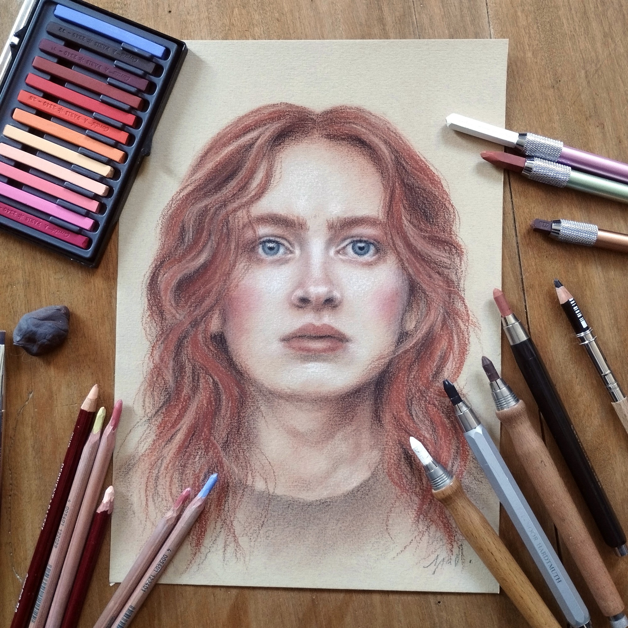 Dessin réalisé de manière traditionnelle aux 3 crayons d'art pierre noire, sanguine et craie blanche, carrés Conté et crayons pastels, sur papier Canson "C" à grain ocre format A4 (21x30 cm). Réalisé en 2025.