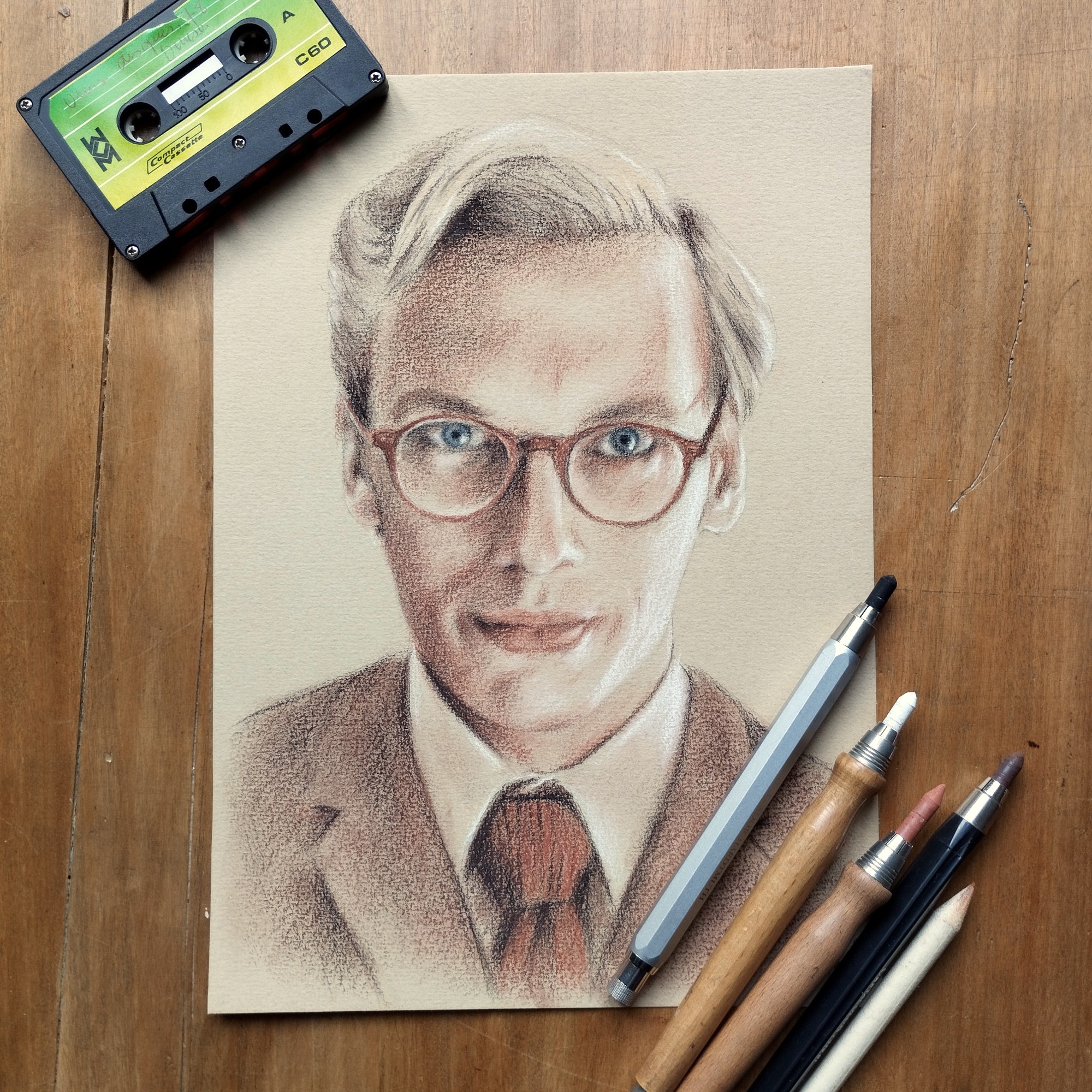 Dessin réalisé de manière traditionnelle aux 3 crayons d'art pierre noire, sanguine et craie blanche, carrés Conté et crayons pastels, sur papier Canson "C" à grain ocre format A4 (21x30 cm). Réalisé en 2025.